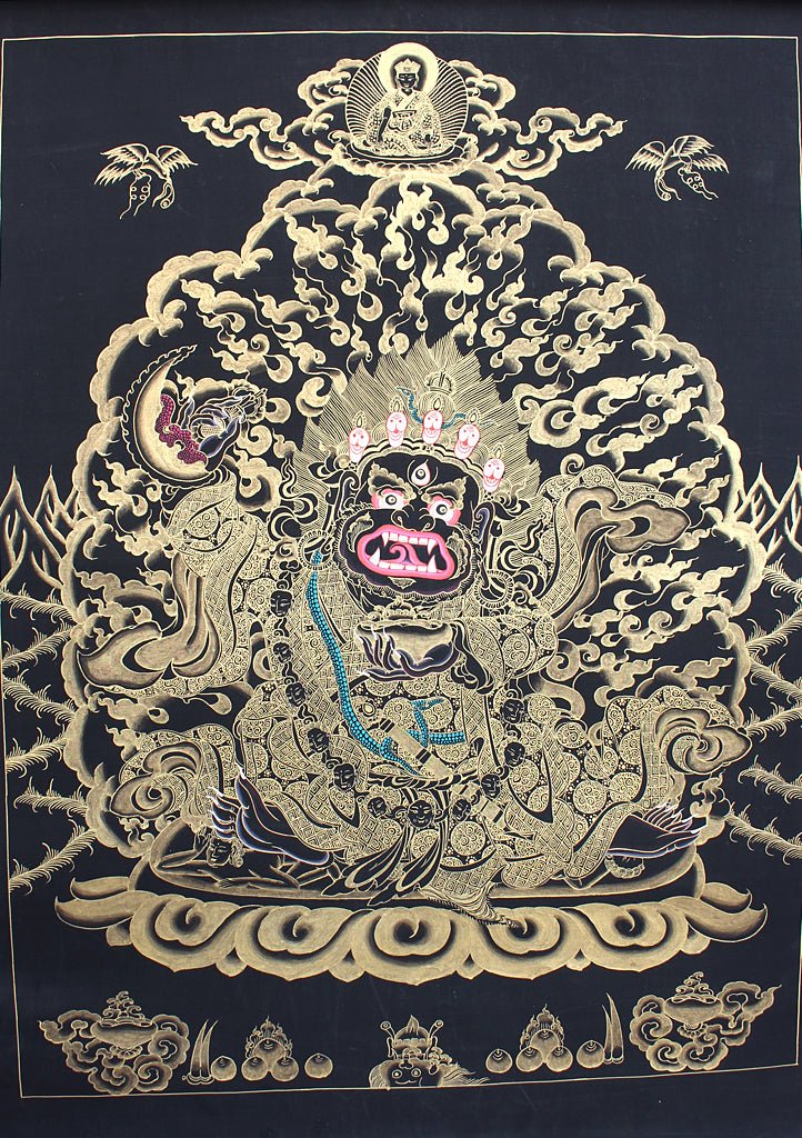 Mahakala is the wrathful and powerful emanation of Avalokistesvara. This deity is celebrated in all Tibetan monasteries at the end of every year during Mahakala Grand Puja when Tibetan monks perform a traditional sacred dance wearing the mask of Mahakala.