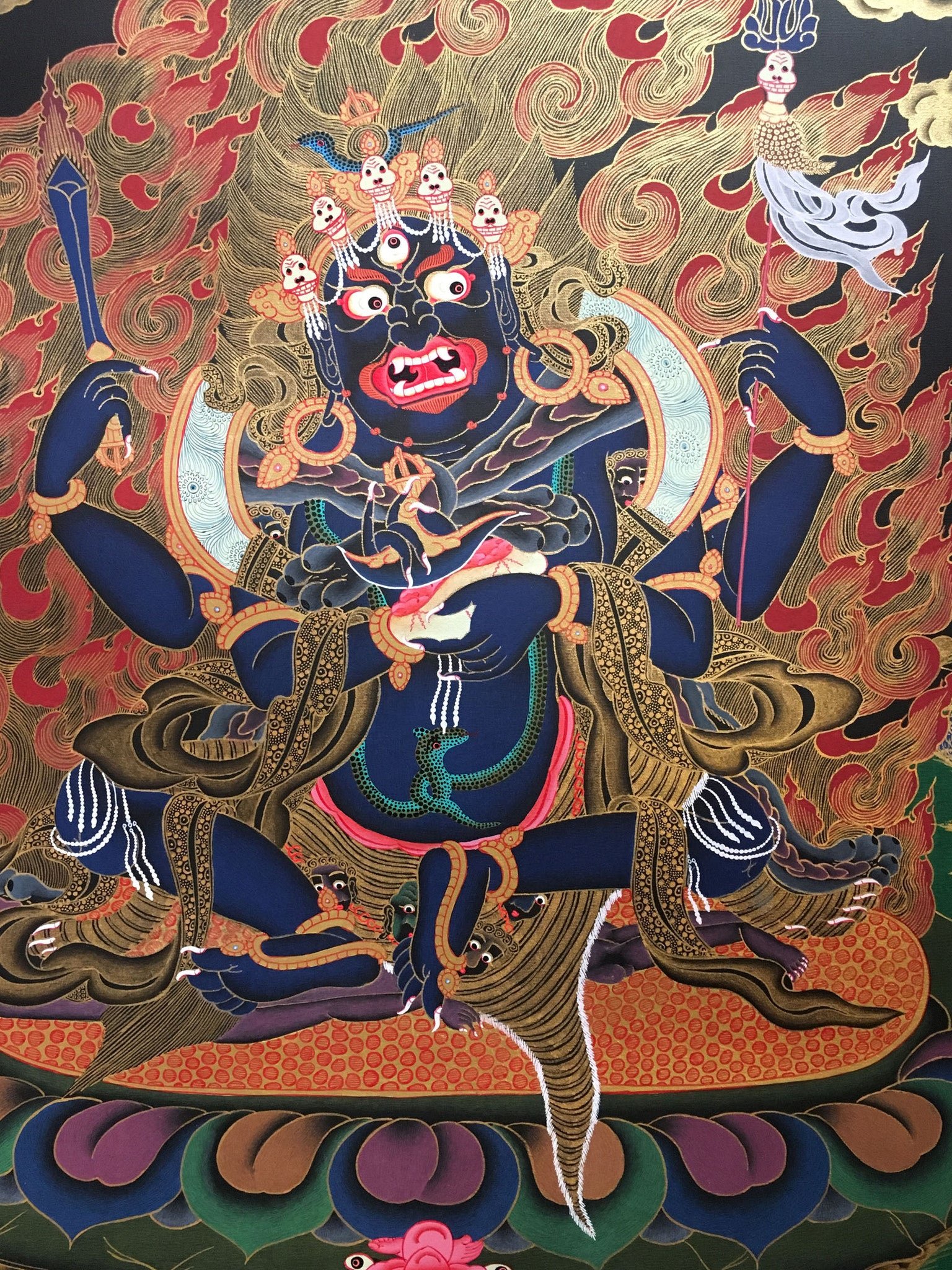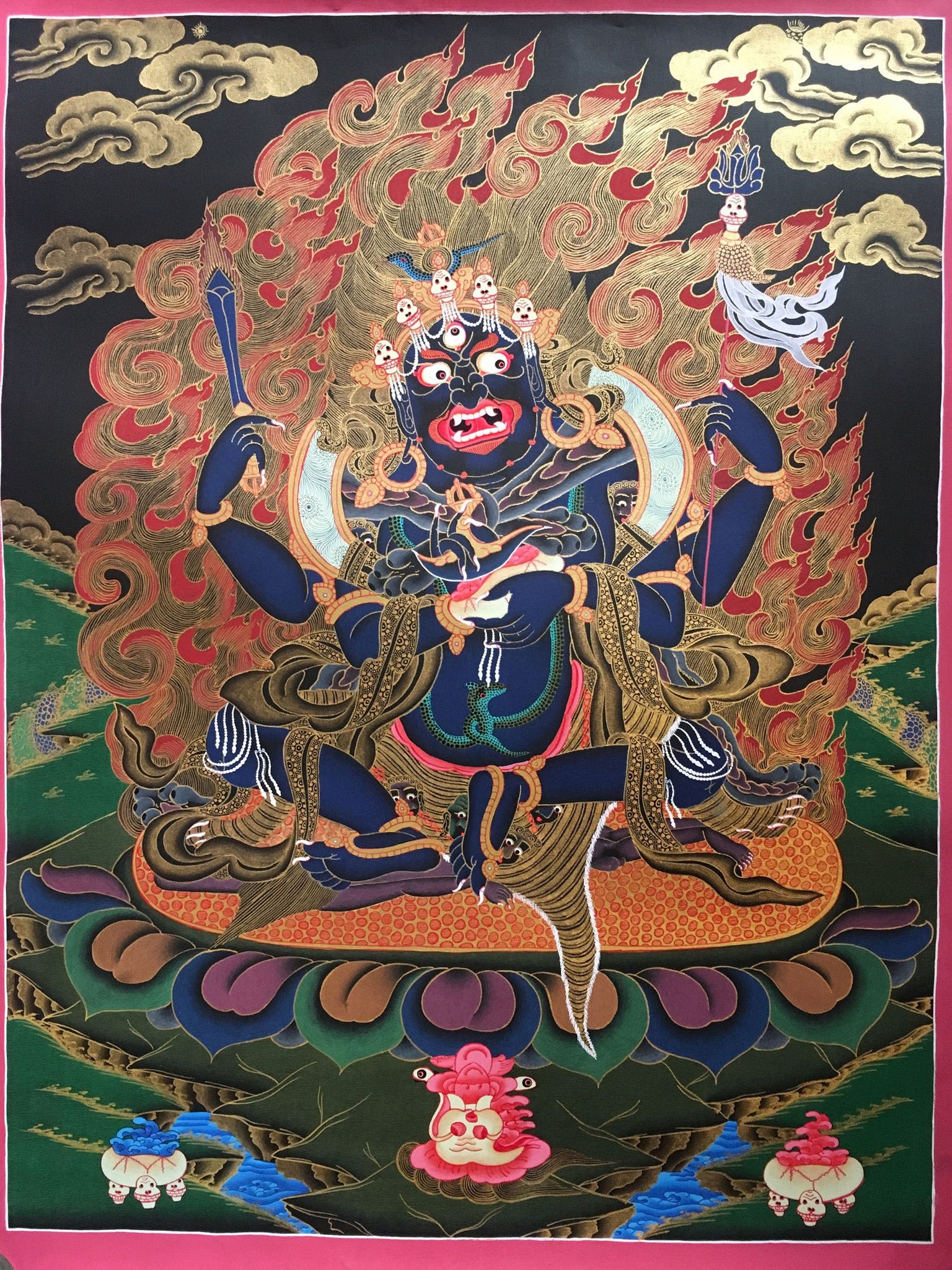 This is a fiery thangka painting of Vajrakilla. The colors used in this thangka are very vibrant and the flames in the background looks very intricate.