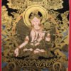 This is a detailed thangka painting of White Tara done on a cotton canvas. The thangka has a black background. Gold toned color is mostly used to paint the thangka except only few strokes of Blue and Green.